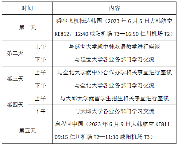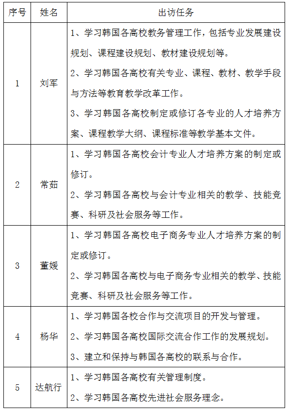 为拓展教职工国际视野,增强教职工国际意识,加强全北学院师资队伍和专业建设,提高学院管理水平,推进国际交流合作,经4月19日学院院长办公会及党委会研究决定,选派以下6名同志于2023年6月5日至6月9日赴韩国全北大学、大邱大学及延世大学进行校际交流。