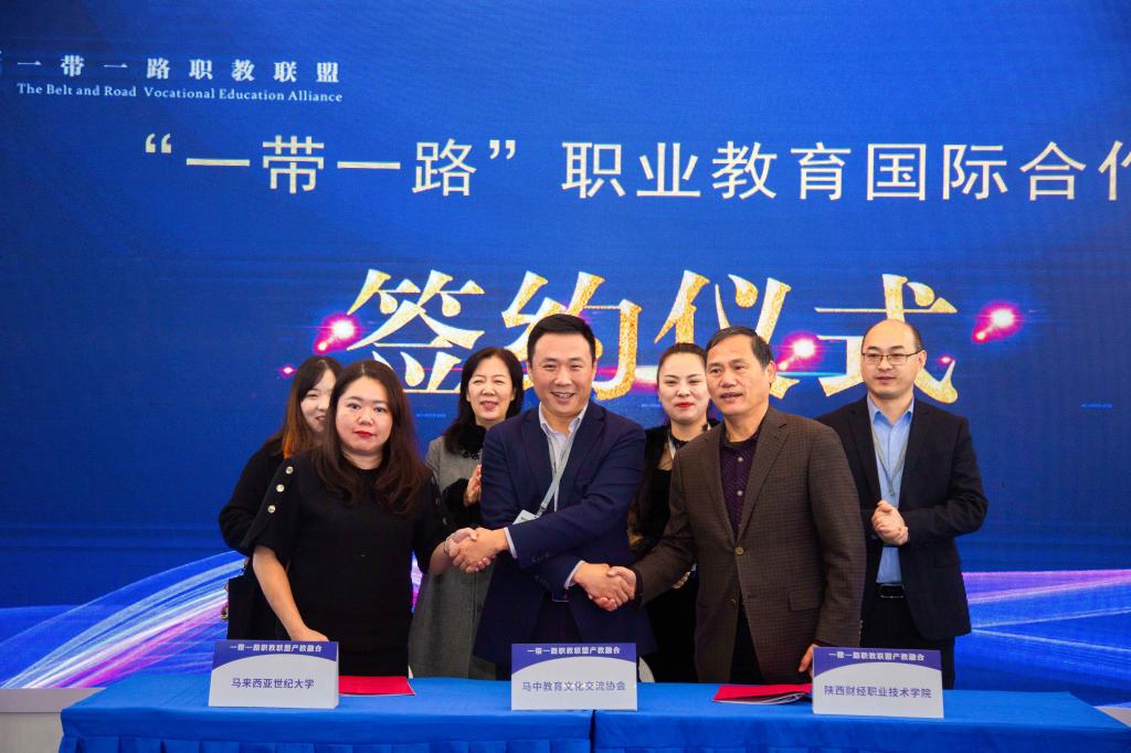 学院领导刘晓玉、国际交流与合作中心负责人杨华、干事贺加贝以及两名学生代表参加此次展会。会议期间,我院以“一带一路”职教联盟理事单位身份展示了学院近年来国际合作交流及产教融合方面所取得的成果,并以此为契机与马来西亚世纪大学签订了合作框架协议、1+3+1专本硕连读项目合作培养协议,同时,举行了与马来西亚世纪大学、马中教育文化交流协会三方共建的马中高等人才联合培养基地的揭牌仪式。仪式由“一带一路”职教联盟秘书处负责人、陕西职业技术学院党委委员、党委统战部部长、国际交流合作部部长张颖娜的主持。